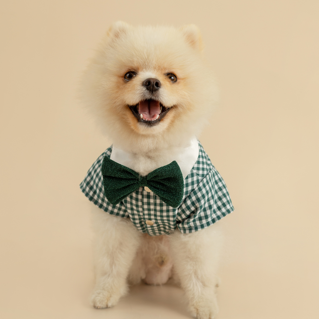 Camisa a cuadros verde, ligera y fresca de material hipoalergénico con cuello blanco y broches en el pecho.